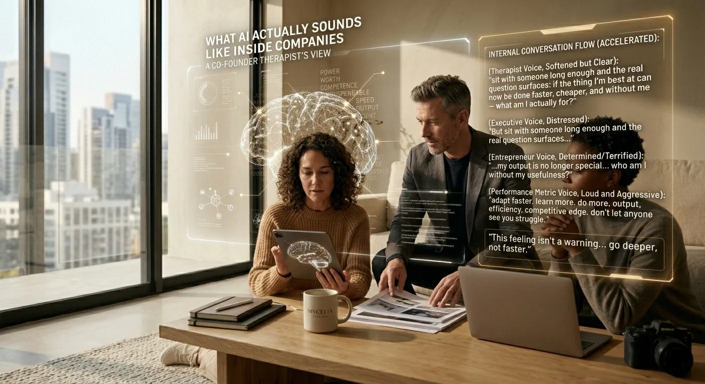 I work inside companies as a co-founder therapist. The AI conversation inside those rooms sounds nothing like what gets published about it. It sounds like every other conversation about power and worth — just faster.