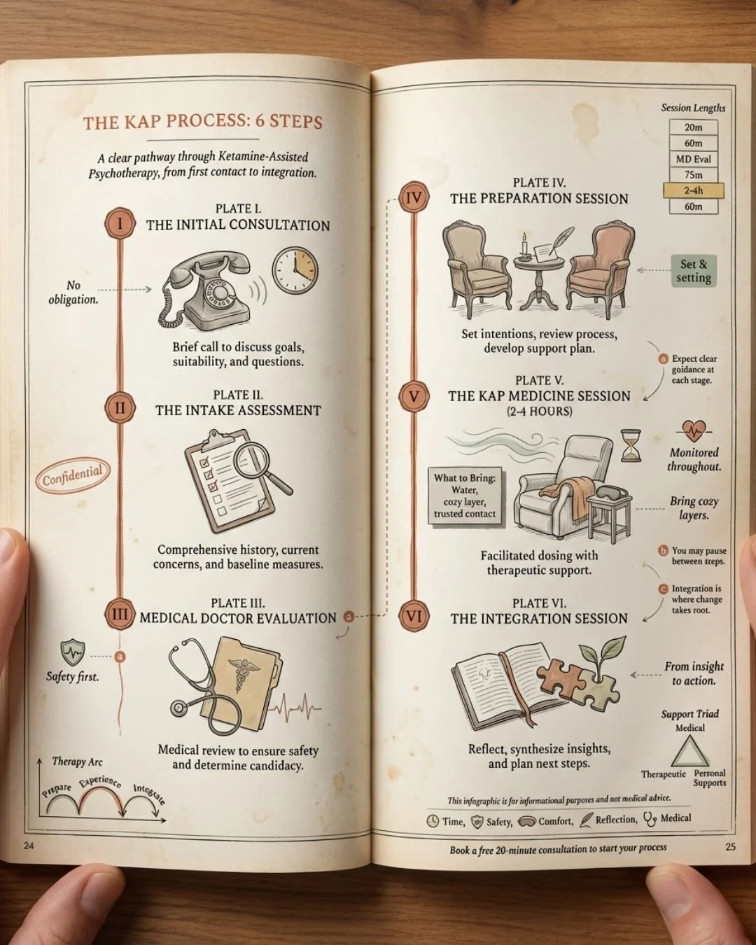 The KAP process has six stages, and the medicine session is only one of them. Here's what the full pathway includes: