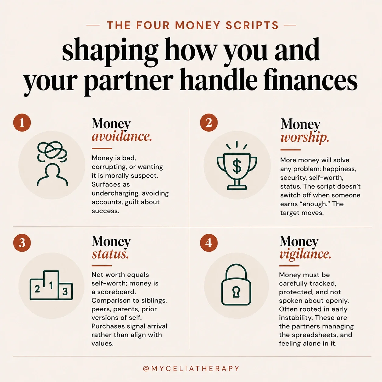 The framework of money scripts comes from financial psychologist Brad Klontz, whose research published in the Journal of Financial Therapy identifies four dominant beliefs formed in childhood and carried, mostly unexamined, into adult relationships. Most of us have a primary and a secondary. Most couples are working with two combinations colliding in real time.