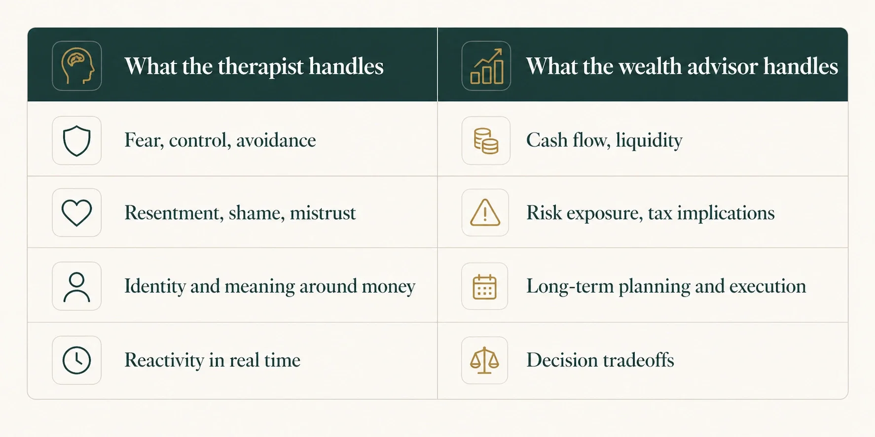 This is unusual. Most therapists work in a silo. Most financial advisors don't have training in the emotional dimensions of money. I've seen what becomes possible when those two streams of expertise are coordinated rather than separate.
