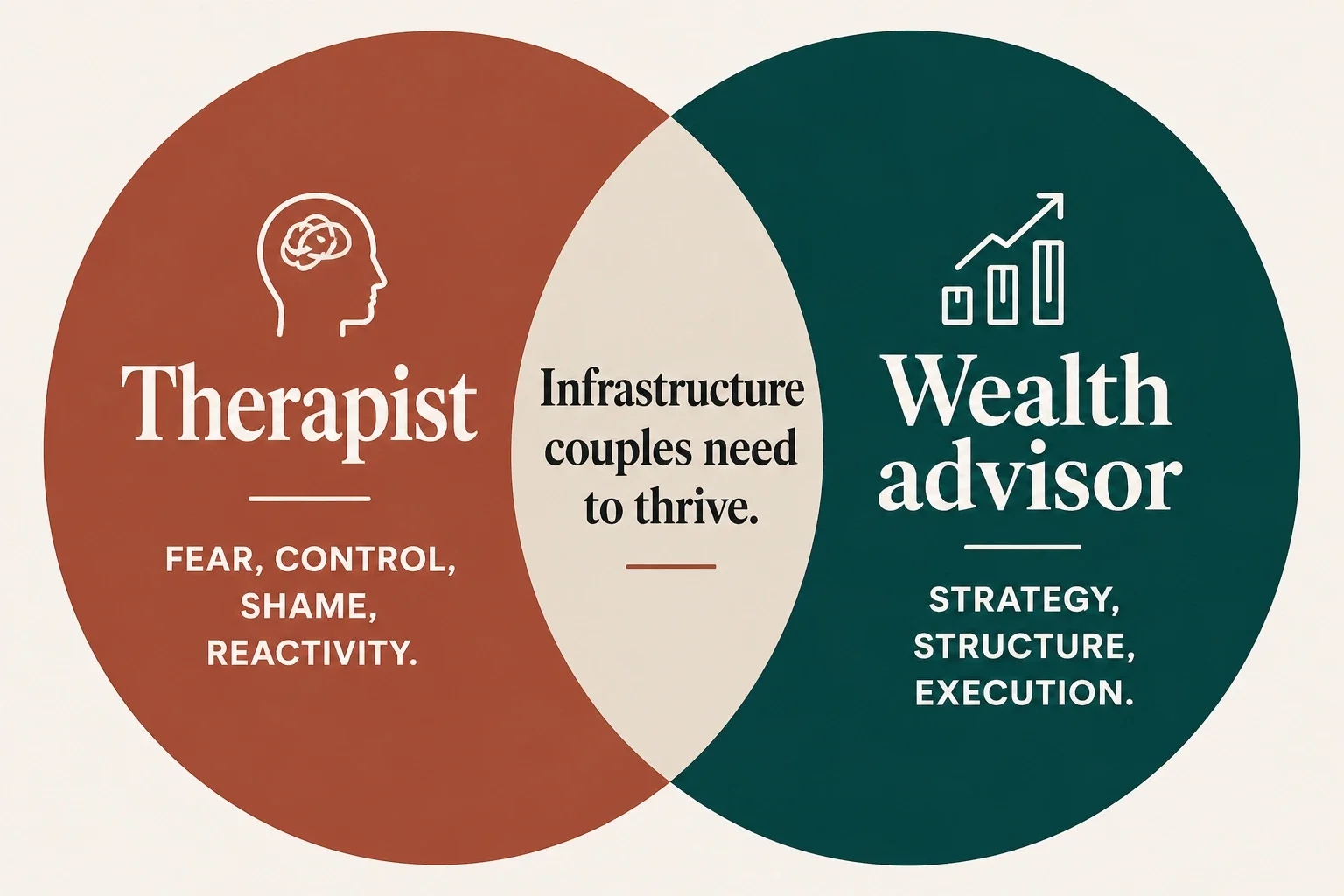 The collaboration begins when the couple's money conflict is not only emotional and not only technical. Sometimes they already have an advisor they trust. Sometimes I refer them into a small network of planners I've vetted. The advisor doesn't need to be "mine." What matters: the couple trusts them, they're competent, and they understand the complexity of working with high-earning couples. Money in this population is tied to identity, safety, power, and family legacy.